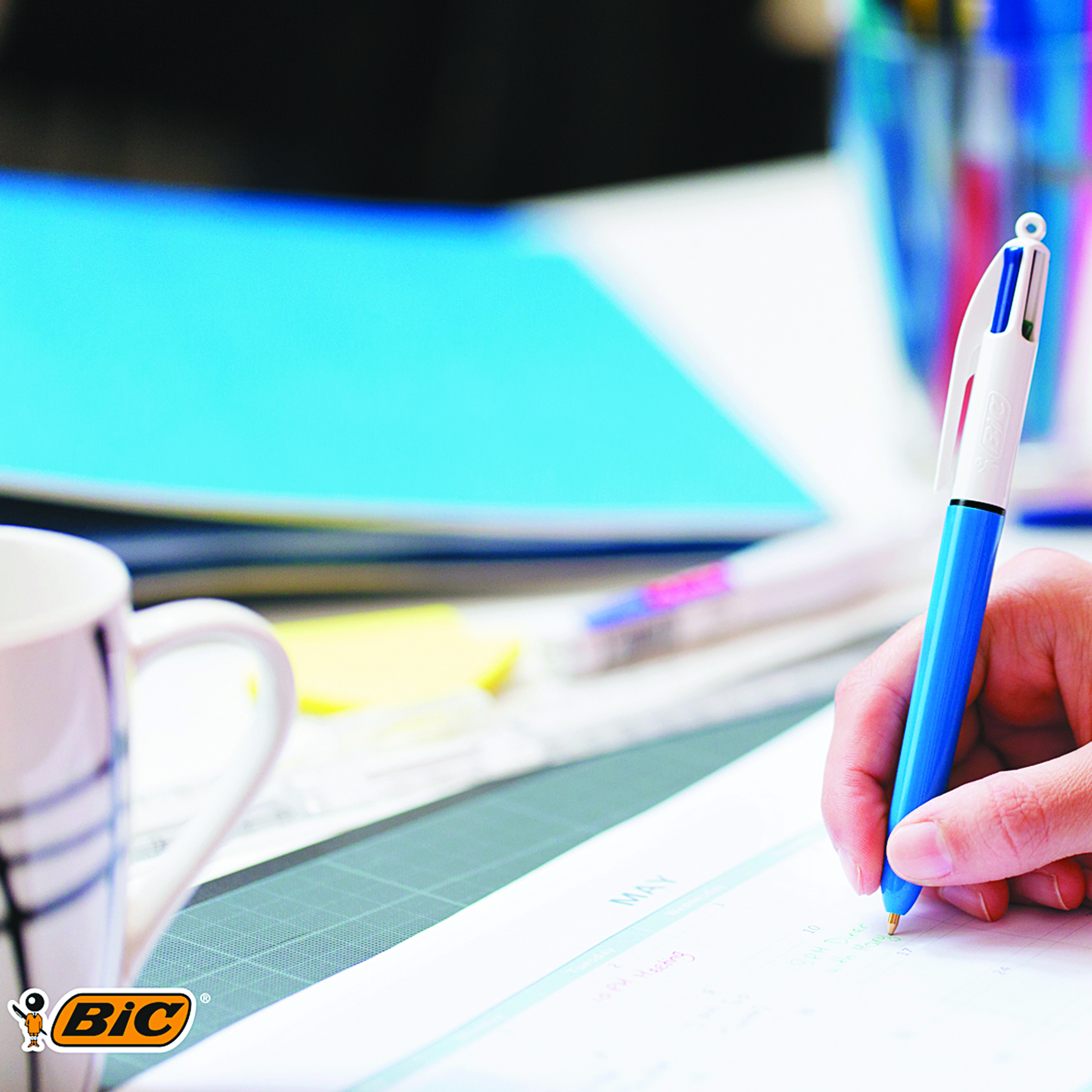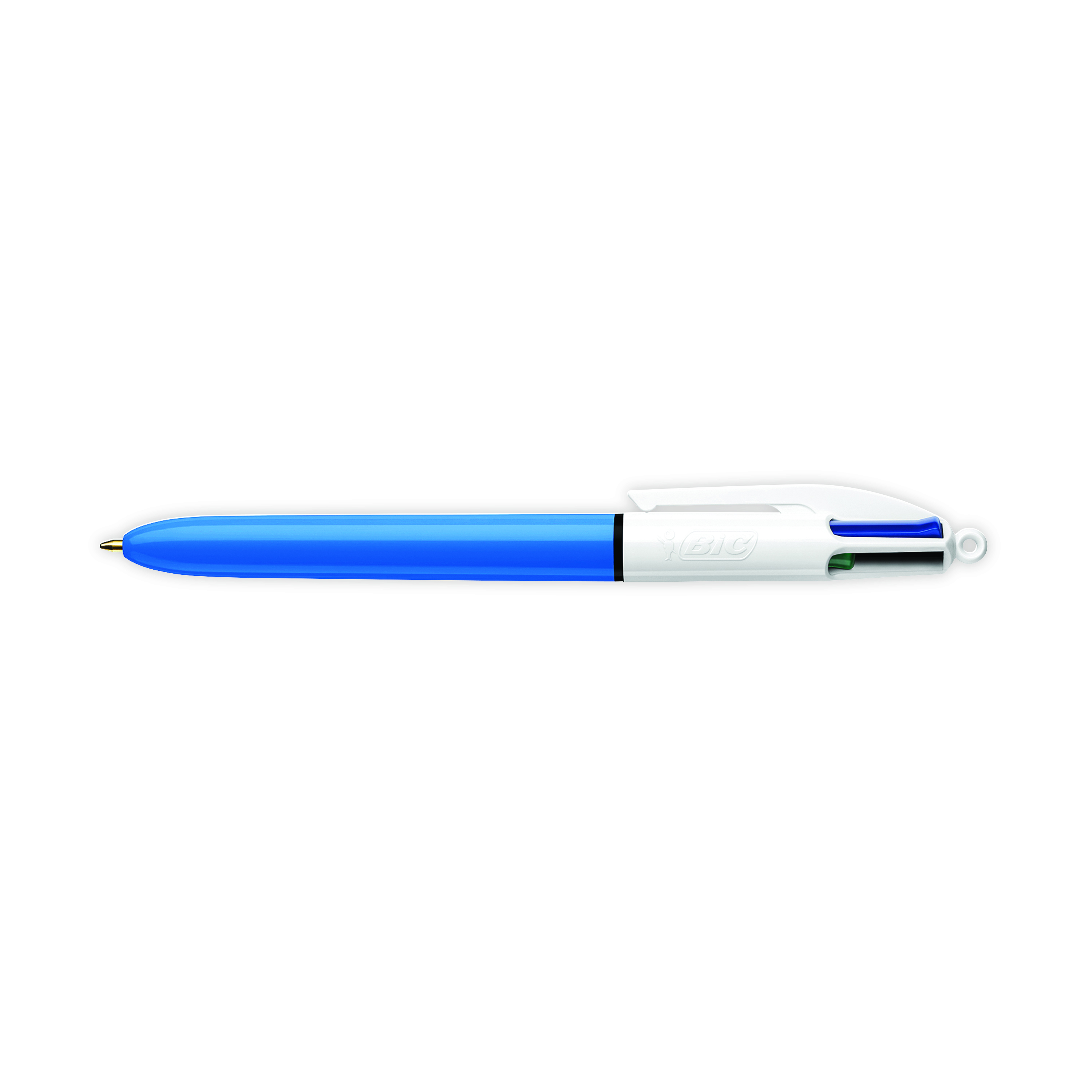 The Bic 4-Colour Pen features four smooth sliders at the top of the barrel for easy selection between black, blue, red and green ink. The chunky blue barrel provides a firm grip for comfort and control. This medium format pen features a 1mm tip for a line width of 0.4mm, ideal for general handwriting use.