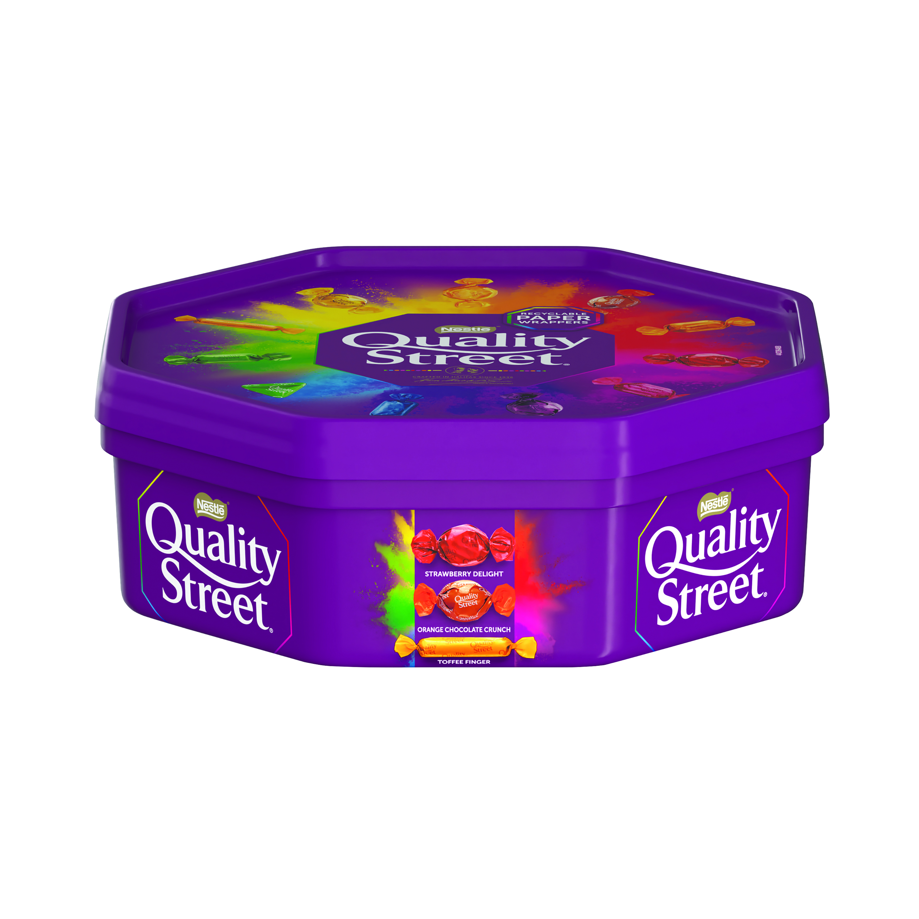 This tub of Quality Street chocolates contains a variety of types of iconic, individually wrapped, milk and dark chocolates, toffees, and fruit creams. Wrapped in recyclable paper, the chocolates are free from artificial colours, flavours or preservatives. Supplied in a 550g tub.